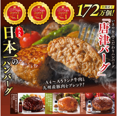 唐津バーグは30年以上にわたってロングセラーとなっているハンバーグで、肉質からスパイスまでこだわって作られています。